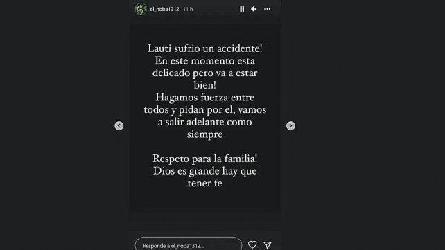 "Lauti sufrió un accidente. En este momento está delicado pero va a estar bien. Hagamos fuerza entre todos y pidan por él; vamos a salir adelante como siempre. Respeto para la familia. Dios es grande: hay que tener fe", informaron desde su entorno a través de la cuenta oficial del músico en Instagram.