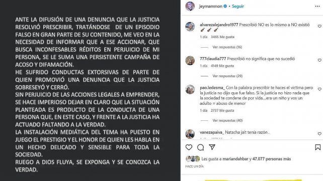 El presentador emitió un comunicado, en el cual señaló que el joven faltó a la verdad ante la Justicia: "La situación planteada es producto de la conducta de una persona que, en este caso, y frente a la Justicia ha actuado faltando a la verdad".