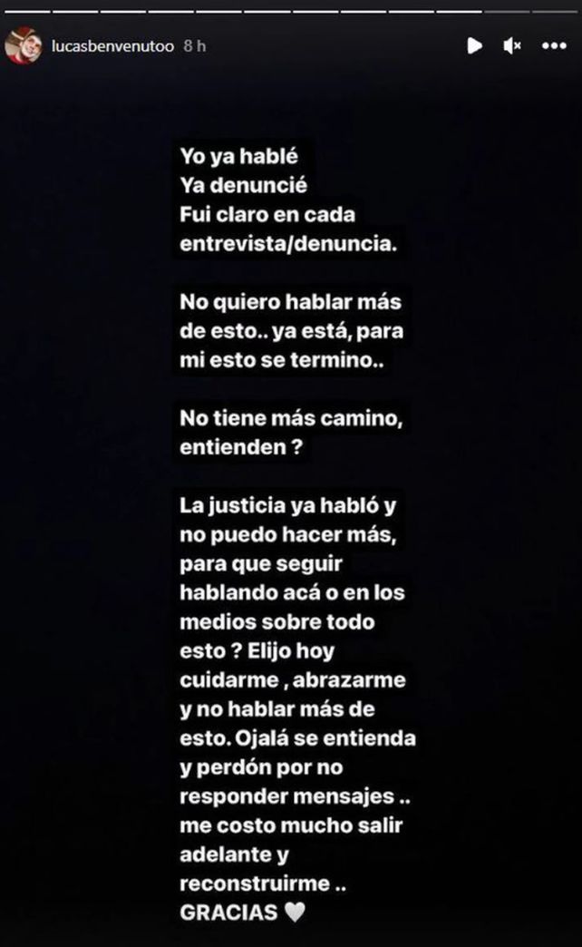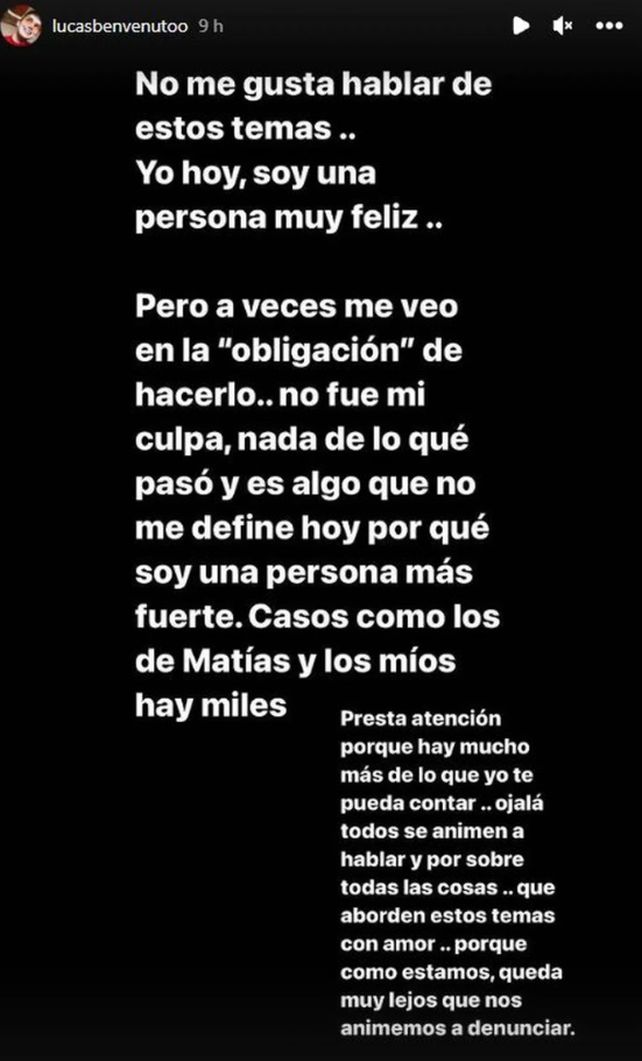 En otra historia de Instagram, Benvenuto se explayó más sobre la causa. “No me gusta hablar de estos temas. Yo hoy soy una persona muy feliz. Pero a veces me veo en la ‘obligación’ de hacerlo. No fue mi culpa nada de lo que pasó. Y es algo que no me define hoy porque soy una persona más fuerte. Casos como los de Matías y los míos hay miles”, escribió. “Ojalá todos se animen a hablar y por sobre todas las cosas que aborden estos temas con amor, porque como estamos, queda muy lejos que nos animemos a denunciar”.