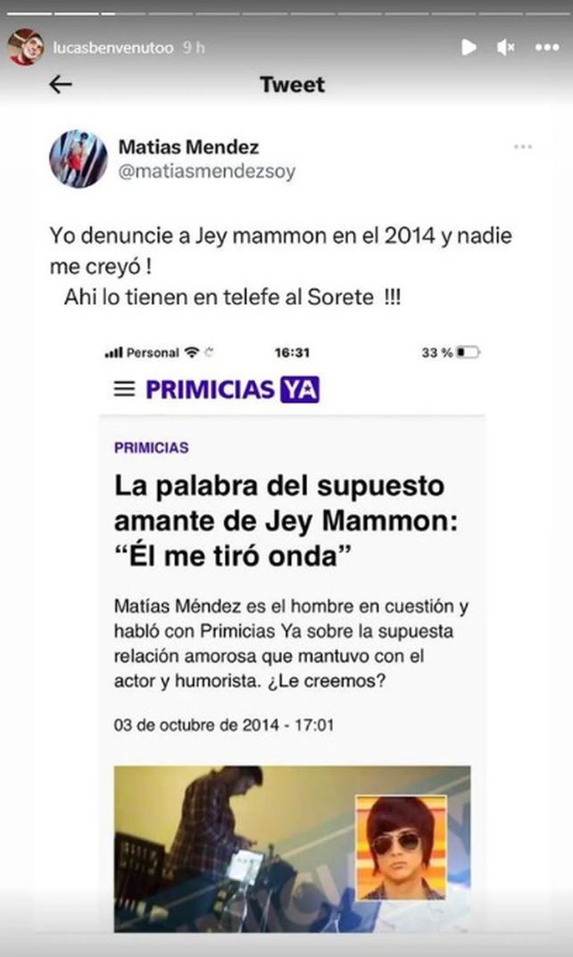 Lucas Benvenuto, un joven que fue víctima de trata en un resonado caso en el que quedó condenado el psicólogo Jorge Corsi, replicó varios posteos en sus redes sociales en los que se deslizó una acusación de abusos sexuales contra Jey Mammón. Su abogado, Javier Moral, aseguró en Socios del Espectáculo (eltrece) que el artista había sido denunciado por su cliente en 2020.