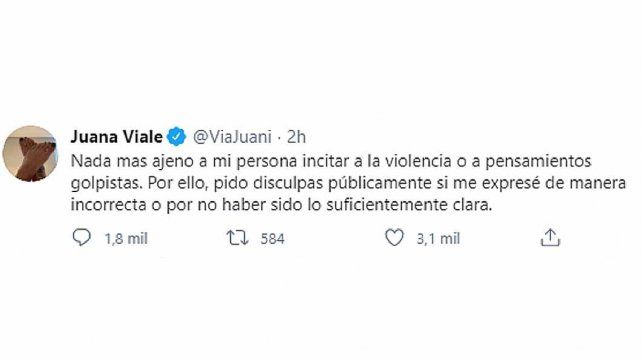 “¿Termina el gobierno? ¿termina el mandato?”, consultó Juana después de que Bárbaro asegurara que el partido que actualmente está en el poder “no gana las próximas elecciones”. Su nombre se convirtió en tendencia en Twitter y el momento en el que ella hizo esta pregunta se volvió rápidamente viral. Ante esta situación, la actriz pidió perdón. “Nada más ajeno a mi persona incitar a la violencia o a pensamientos golpistas. Por ello, pido disculpas públicamente si me expresé de manera incorrecta o por no haber sido lo suficientemente clara”, escribió.