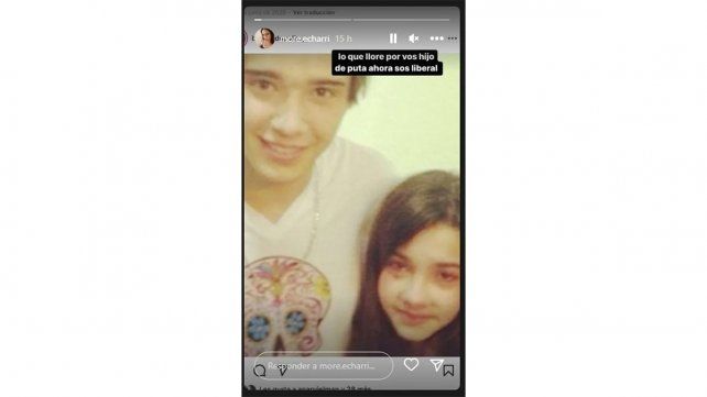 A través de historias, Morena compartió una imagen que data de varios años atrás en la que aparece el youtuber posando junto a ella y sobre la foto escribió: "Lo que lloré por vos, hijo de p... ahora sos liberal". Por el momento, el artista no respondió al mensaje que publicó la adolescente.