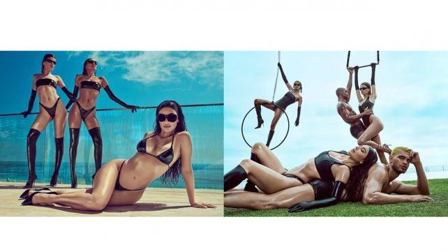 Kim Kardashian abrió la sesión de fotos con una imagen de ella tumbada en el suelo junto a dos modelos que también usan el conjunto creado por la empresaria con un mar turquesa en calma de fondo. En la siguiente imagen, Kardashian se recuesta sobre la espalda de un modelo que también usa una versión masculina de su nueva línea de ropa. Para la foto, Kim cambia los tacones por botas hasta el muslo y la reveladora parte de arriba del bikini por un top con cremallera. Unos guantes sedosos en tonos negros terminaron la combinación.