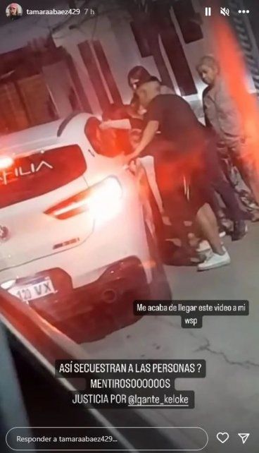 “Me acaba de llegar este video a mi WhatsApp. ¿Así secuestran a las personas? Mentirosos. Justicia por L-Gante”, lanzó desde sus historias de Instagram Tamara arrobando a L-Gante.