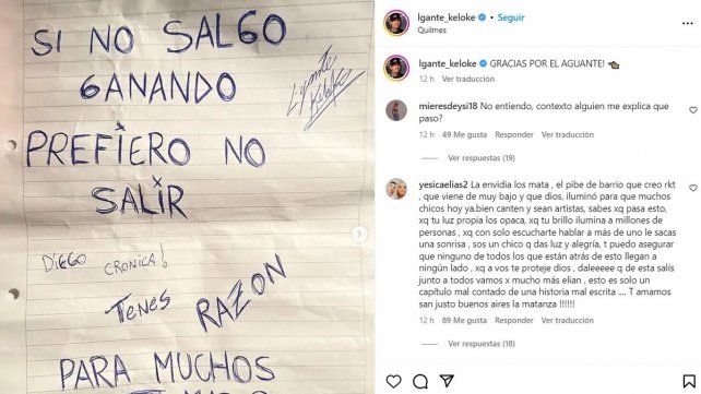 Fue a través de un posteo en Instagram donde el vocalista se expresó con mensajes escritos por él mismo en una hoja: “Si no salgo ganando prefiero no salir. Diego Crónica, tenés razón. Para muchos soy más que un grano”, manifestó.