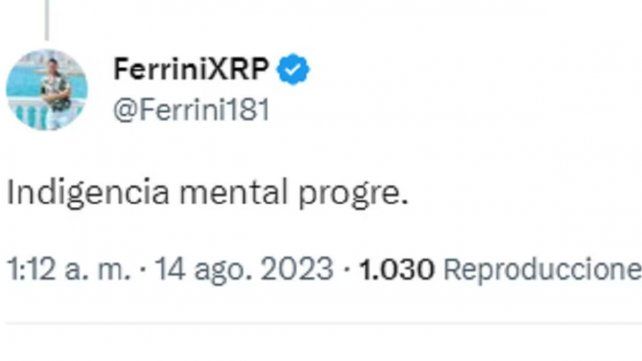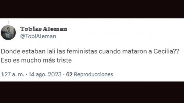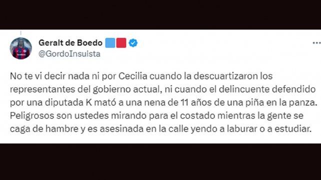 “No te vi decir nada ni por Cecilia cuando la descuartizaron los representantes del gobierno actual, ni cuando el delincuente defendido por una diputada K mató a una nena de 11 años de una piña en la panza. Peligrosos son ustedes mirando para el costado mientras la gente se caga de hambre y es asesinada en la calle yendo a laburar o a estudiar”, le recriminó una persona identificada con el nombre @GordoInsuista.