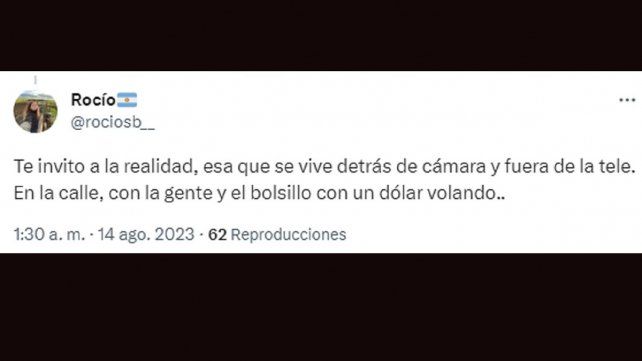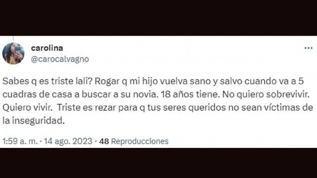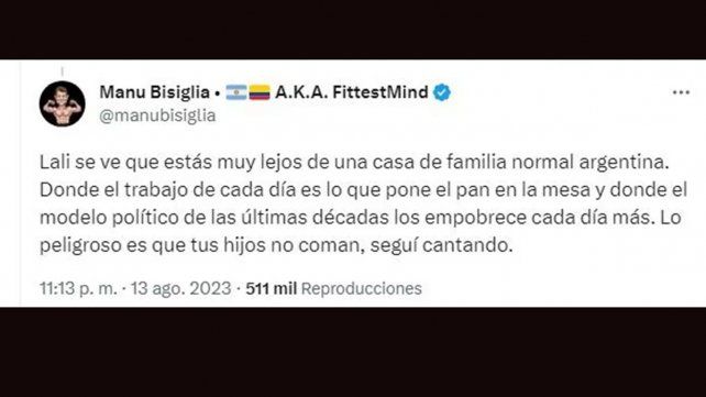 “Lali, se ve que estás muy lejos de una casa de familia normal argentina. Donde el trabajo de cada día es lo que pone el pan en la mesa y donde el modelo político de las últimas décadas los empobrece cada día más. Lo peligroso es que tus hijos no coman”, planteó un usuario llamado Manu Bisiglia, que también le recomendó que “siga cantando”.