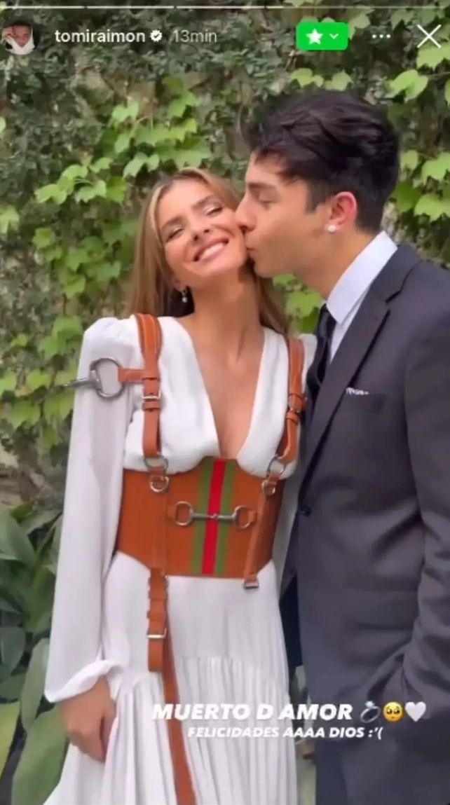 Un amigo de ambos subió a su cuenta de Instagram un video, donde se la ve a la actriz con un vestido elegante blanco y al cantante, de traje, dándole un beso en la mejilla.