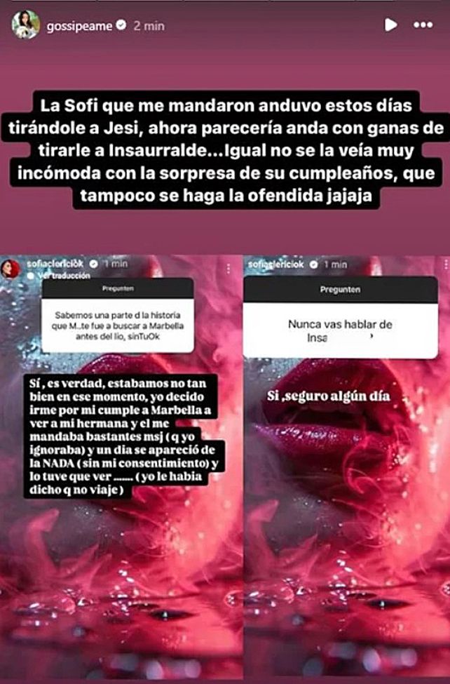 Lo hizo mediante una caja de preguntas y respuestas en su cuenta de Instagram: “Sabemos una parte de la historia que M... te fue a buscar a Marbella antes del lío sin tu ok”, escribió un seguidor. "Sí, es verdad, estábamos no tan bien en ese momento”, confirmó. Y detalló cómo fue se encontraron: “Yo decidí irme por mi cumple a Marbella a ver a mi hermana y él me mandaba bastantes mensajes que yo ignoraba".