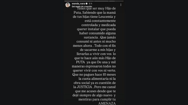 La publicación dejó al descubierto el conflicto que la expareja mantiene desde su separación. Wanda aseguró que se siente víctima de un hostigamiento que afecta su salud emocional y cuestionó duramente el accionar del padre de sus hijas, Francesca e Isabella. “Ya que de una y mil maneras expresaron todos no querer vivir con vos ni verte”, sostuvo.