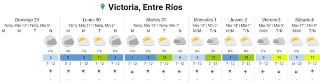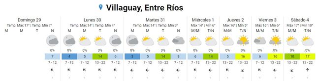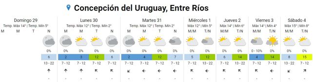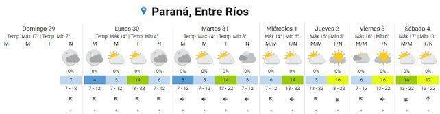 Para el lunes, la temperatura mínima promedio bajará a 4 grados y la máxima a 14. El cielo estará parcialmente nublado durante toda la jornada y los vientos soplarán predominantes del sudeste.