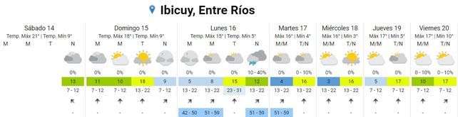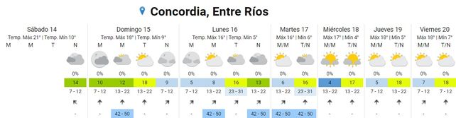 SUR DE ENTRE RIOS Y NORESTE DE BUENOS AIRES: PARCIAL NUBLADO. VIENTOS LEVES DEL SUDOESTE, AUMENTANDO TEMPORARIAMENTE A MODERADOS. TEMPERATURA MINIMA ENTRE 2ºC Y 5ºC. TEMPERATURA MAXIMA ENTRE 16ºC Y 17ºC.