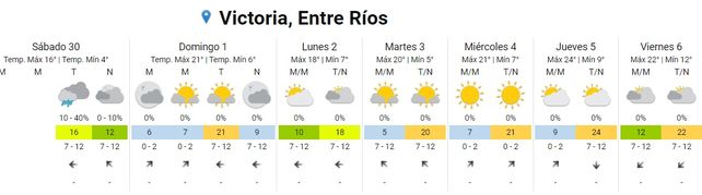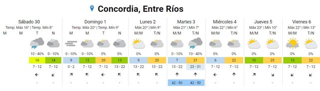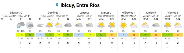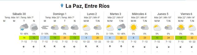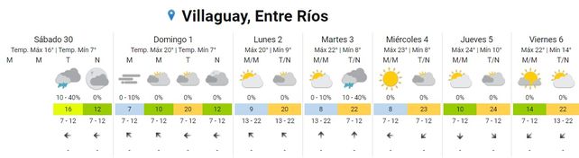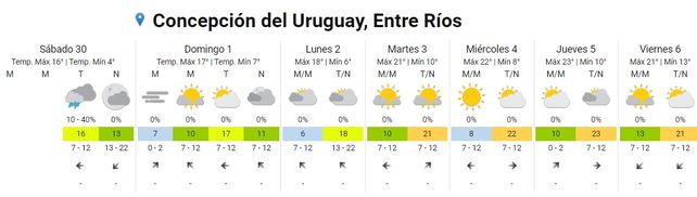 En el norte y el sur de la provincia el cielo permanece mayormente nublado en ambas costas, del Uruguay y del Paraná. La temperatura más baja de la provincia se registró en Gualeguaychú y alrededores, con una mínima de 4 grados. Para la zona de Concordia se esperaban algunos chaparrones para la tarde de este sábado.