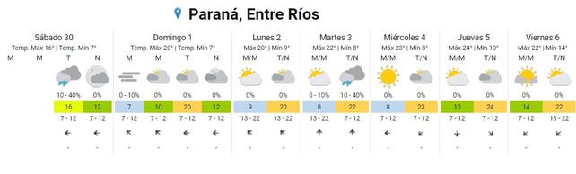 El Servicio Meteorológico Nacional (SMN) prevé para lo que resta de la jornada del sábado lluvias aisladas y cielo parcialmente nublado, con vientos provenientes del sector este. El día comenzó nublado y fresco, en un anticipo del clima que se espera para todo el fin de semana en Paraná y la región.