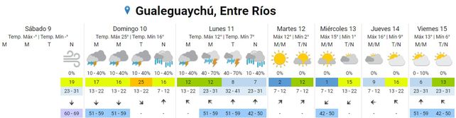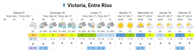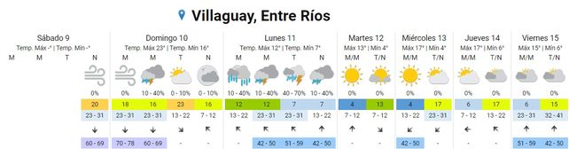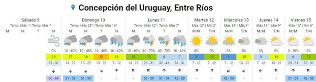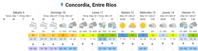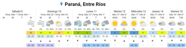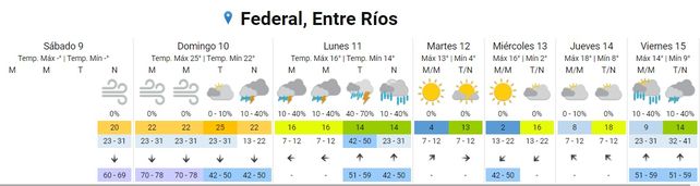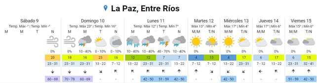 El Servicio Meteorológico Nacional (SMN) incluyo a Entre Ríos en un alerta por vientos. "El área será afectada por vientos del sector norte con velocidades entre 20 y 30 km/h, y ráfagas que pueden superar los 80 km/h, que cambiaran al sector sur a partir de la madrugada del domingo sobre Entre Ríos, La Pampa, Córdoba, noroeste de Buenos Aires y sur de Santa Fe. Puntualmente se señala a las localidades de Diamante, La Paz, Nogoyá, Paraná y Villaguay.