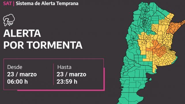Un alerta naranja por tormentas fuertes abarca Buenos Aires, Córdoba, Corrientes, Misiones y Santa Fe, en tanto la Ciudad Autónoma de Buenos Aires, Chaco, Entre Ríos, Formosa, La Pampa, La Rioja, San Luis, Santiago del Estero y Santa Cruz se encuentran bajo alerta amarilla por la misma condición meteorológica, se informó oficialmente. Los departamentos de Entre Ríos con la misma alerta son Colón, Gualeguaychú, Islas del Ibicuy, Tala y Uruguay.