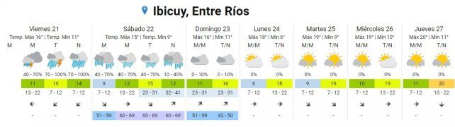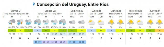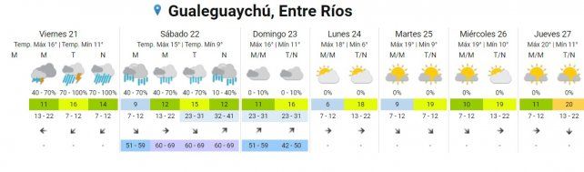 En tanto, el domingo está pronosticado cielo nublado, chaparrones que se extenderán toda la jornada, vientos del sector sudeste rotando al este, con ráfaga de hasta 50 kilómetros por hora y una temperatura mínima de 10 grados y máxima de 16.