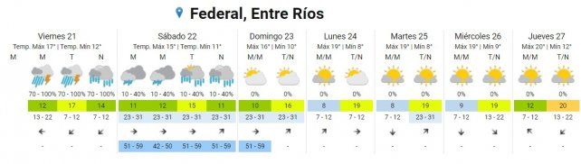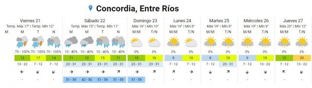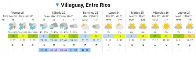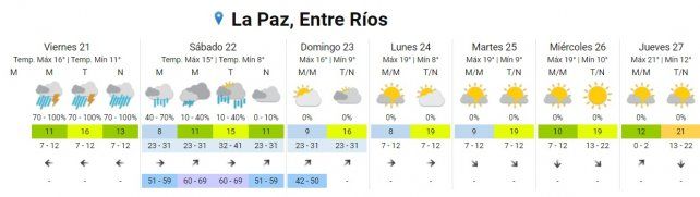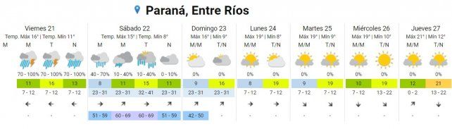 Para mañana, sábado, el organismo prevé una jornada con cielo nublado, lluvias durante todo el día, más fuertes por la mañana, y chaparrones por la noche, vientos del este rotando al oeste, con ráfagas de hasta 70 kilómetros por hora y una temperatura que se ubicará entre los 10 grados de mínima y 16 de máxima. Estiman que esta zona “será afectada por vientos del sector sur con velocidades entre 30 y 60 km/h, con ráfagas que podrían alcanzar los 75 km/horas. Sobre el Río de la Plata se esperan vientos del sector este con similares intensidades”.