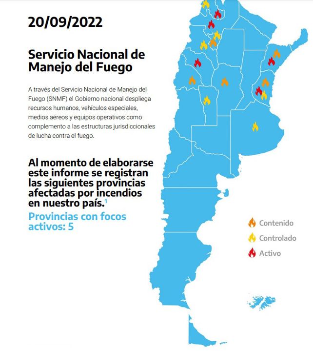 Entre Ríos y las provincias de Corrientes, La Rioja, Jujuy y Salta registran incendios activos este martes, según informó el Servicio Nacional de Manejo de Fuego (SNMF).