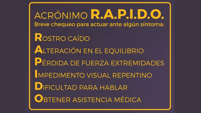 Ante cualquiera de estos síntomas, la Federación Argentina de Cardiología (FAC) recomienda conocer el acrónimo R.A.P.I.D.O. que marca un breve chequeo para que las personas puedan actuar.