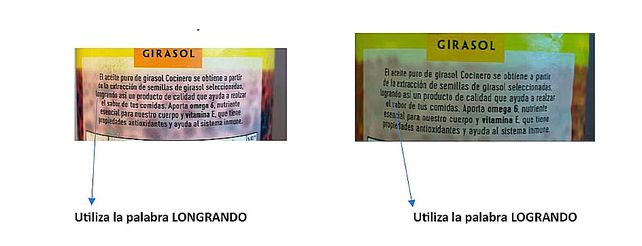 Otra diferencia significativa se encuentra en la descripción del proceso de obtención del aceite. En el envase falsificado, aparece un error ortográfico en el texto, donde se utiliza la palabra “longrando” en lugar de “logrando”.