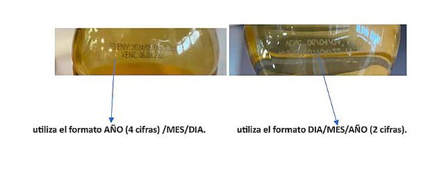 El producto auténtico utiliza el formato “día/mes/año”, mientras que el falsificado la indica en el orden “año/mes/día”.