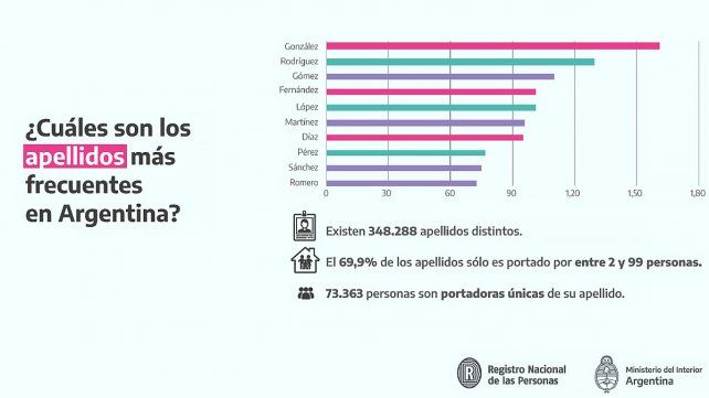 La existencia de 348.288 apellidos distintos en Argentina fue identificada por la Dirección Nacional de Población (DNP), que además registró que González, Rodríguez y Gómez son los tres más recurrentes a nivel nacional. La DNP, oficina del Registro Nacional de las Personas (Renaper) que depende del ministerio del Interior, confeccionó un informe denominado “Distribución geográfica de apellidos en Argentina”, que analiza la distribución espacial de los apellidos de la población actual de Argentina.