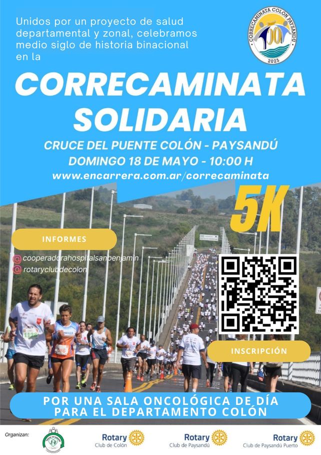 Los clubes Rotary de Colón, Paysandú y Paysandú Puerto organizarán este domingo 18 de mayo en el Puente Internacional Artigas la Corre Caminata Binacional por el 50° aniversario del viaducto. La actividad es impulsada junto a la Cooperadora del Hospital San Benjamín y cuenta con el respaldo de CARU.