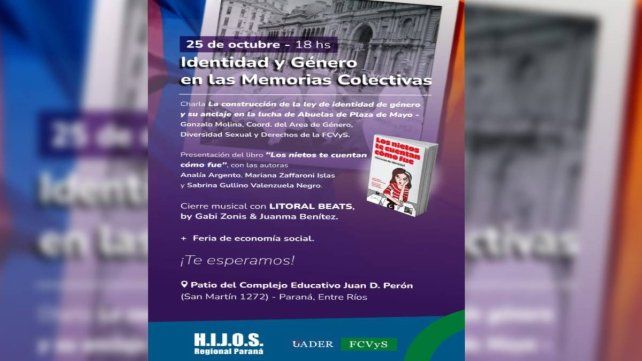 Organizada por la Facultad de Ciencias de la Vida y la Salud (UADER) y la agrupación H.I.J.O.S. Regional Paraná, la actividad lleva por título Identidad y Género en las Memorias Colectivas.