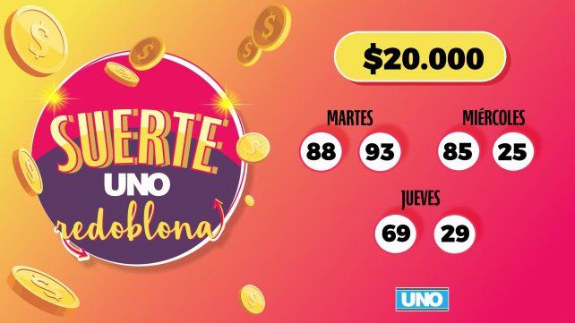Este jueves podés ganar 20.000 pesos con Suerte UNO Redoblona, que en su segunda semana tiene acumulado 20.000 pesos. Compará los números publicados con los de tu DNI -separando los últimos 6 dígitos de a dos cifras consecutivas- al derecho y al revés.