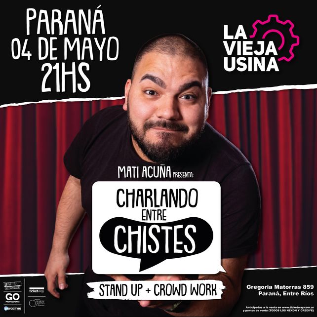 Matías Acuña se presenta el sábado 4 de mayo en La Vieja Usina - Gregoria Matorras 859 - a las 21 con su Unipersonal de Stand up “Charlando entre Chistes”, un nuevo show donde mezcla las introvertidas ideas de su monólogo con la opinión y anécdotas del público en vivo, incluyendo en el mismo historias de la infancia y la vida.