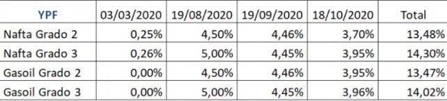 YPF aumentó precios de combustibles en puntos del interior