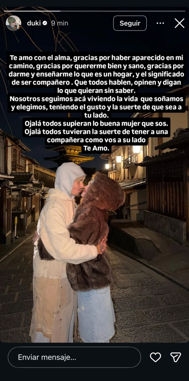 En medio de la controversia que rodea a Emilia Mernes, Duki publicó un mensaje en sus historias de Instagram en el que salió a respaldar públicamente a su pareja y cuestionó las críticas que circularon en redes sociales.