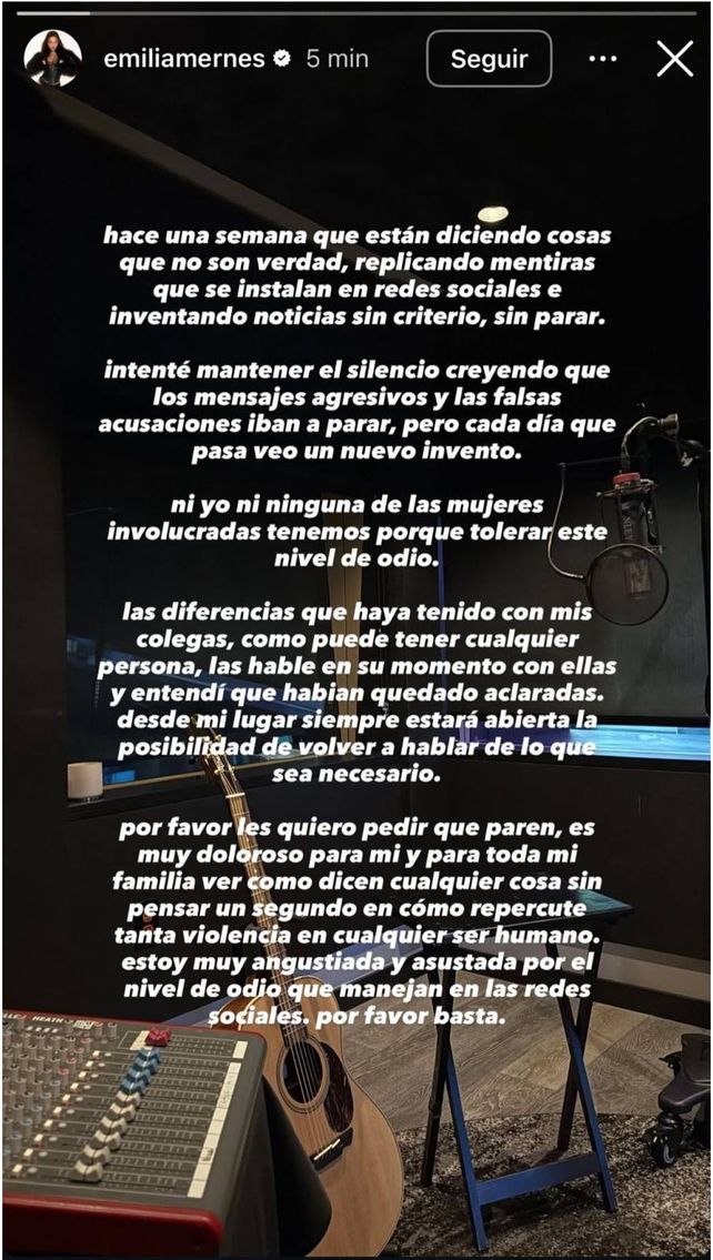 A través de una historia de Instagram, Emilia explicó por qué decidió hablar públicamente después de varios días de silencio. “Intenté mantener el silencio creyendo que los mensajes agresivos y las falsas acusaciones iban a parar, pero cada día que pasa veo un nuevo invento”, expresó.